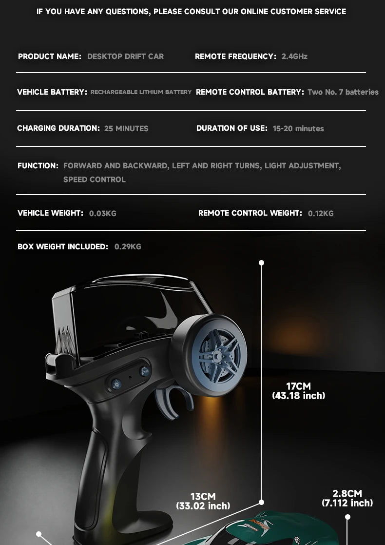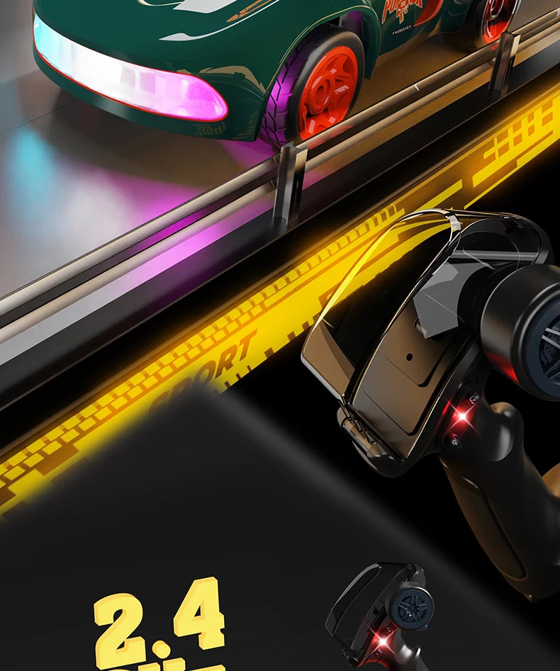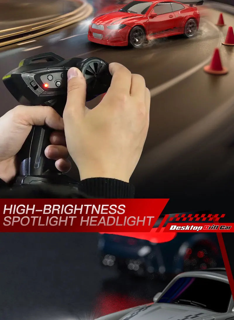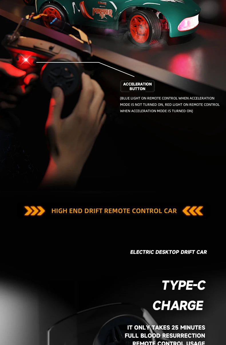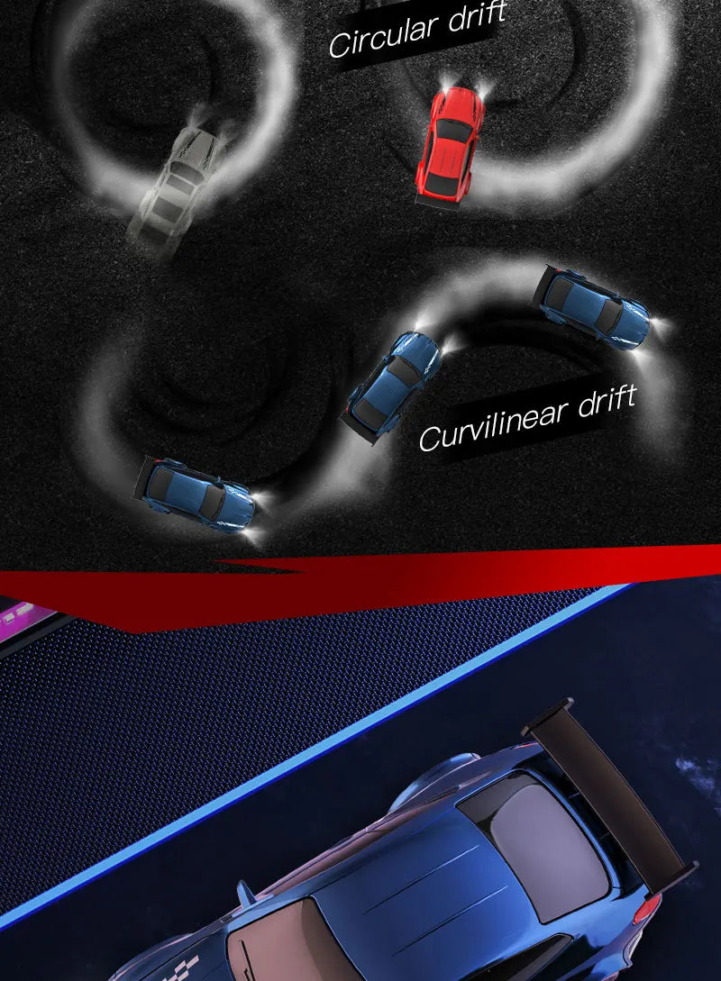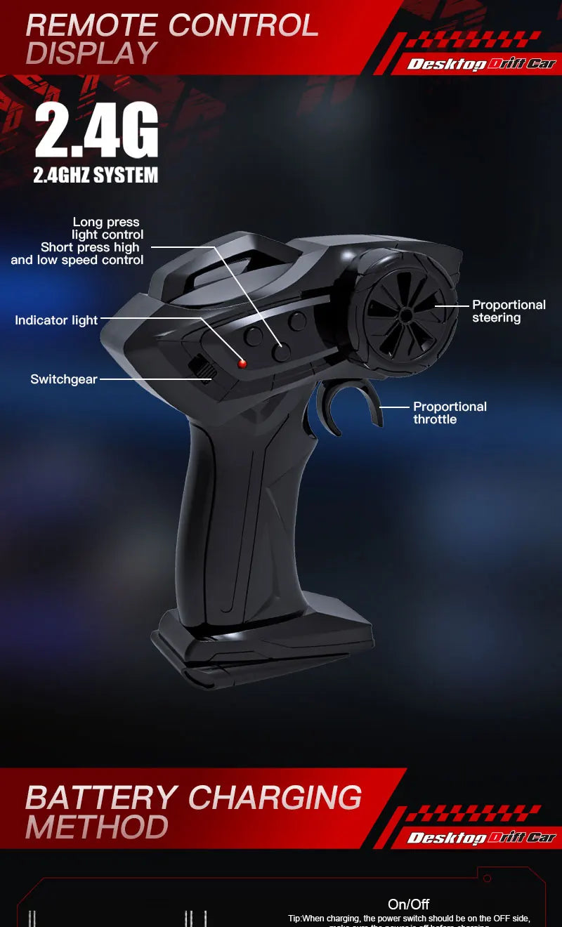Integrated design of remote control and remote control car, proportional four-wheel drive control, racing drift dual mode, can change different tires, forward, backward, left turn, right turn. The product has a high and low speed switch, which can adapt to various environmental gameplay.