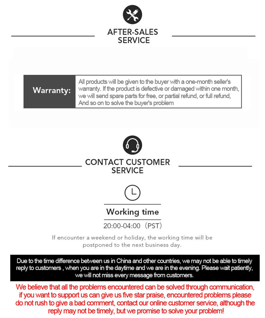 8. Don't open dispute before cantact us.All the problems can be solved by patients.we will do our best to solve it!