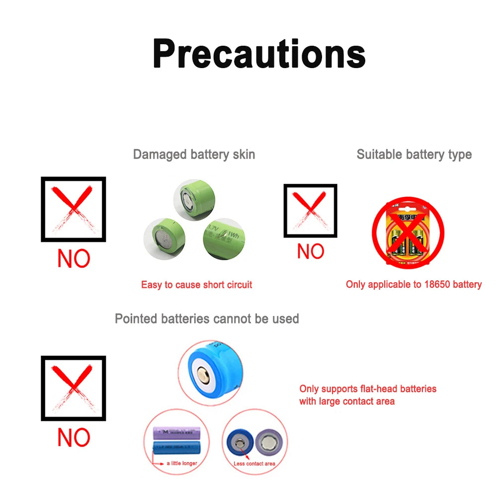 4.Battery type: 18650 flat battery (flat, not flashlight-specific 18650 battery)