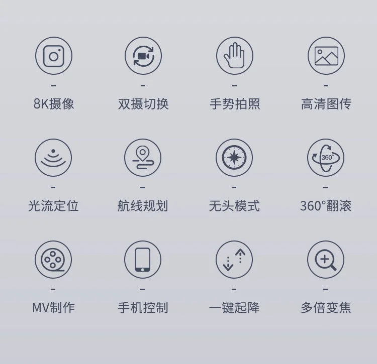 Up/down, Forward/backward, Turn left/right, Sideward flight, 3-level flight speed, LED Light, Headless Mode, One Key Automatic Return, Altitude Hold Mode, WiFi FPV, Trajectory Flight, Camera/Video