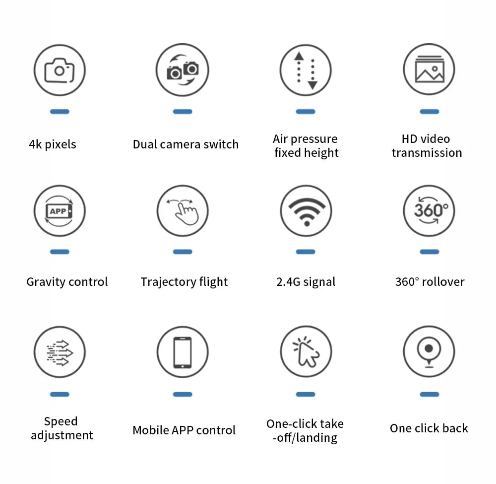 Up/down, Forward/backward, Turn left/right, Sideward flight, 3-level flight speed, LED Light, Headless Mode, One Key Automatic Return, Altitude Hold Mode, WiFi FPV, Trajectory Flight, Camera/Video