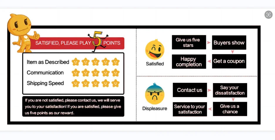 If you are not satisfied with the items, please feel free to contact me for solution instead of leaving neutral or negative feedback, We will try our best to solve the problem. Please leave positive feedback and 5 stars if you are satisfied with our items and services.)Thank you